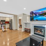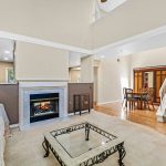 The downstairs living area features rich oak hardwood floors, a double-sided gas fireplace with marble surround, formal living and dining rooms, a cozy family room with recessed